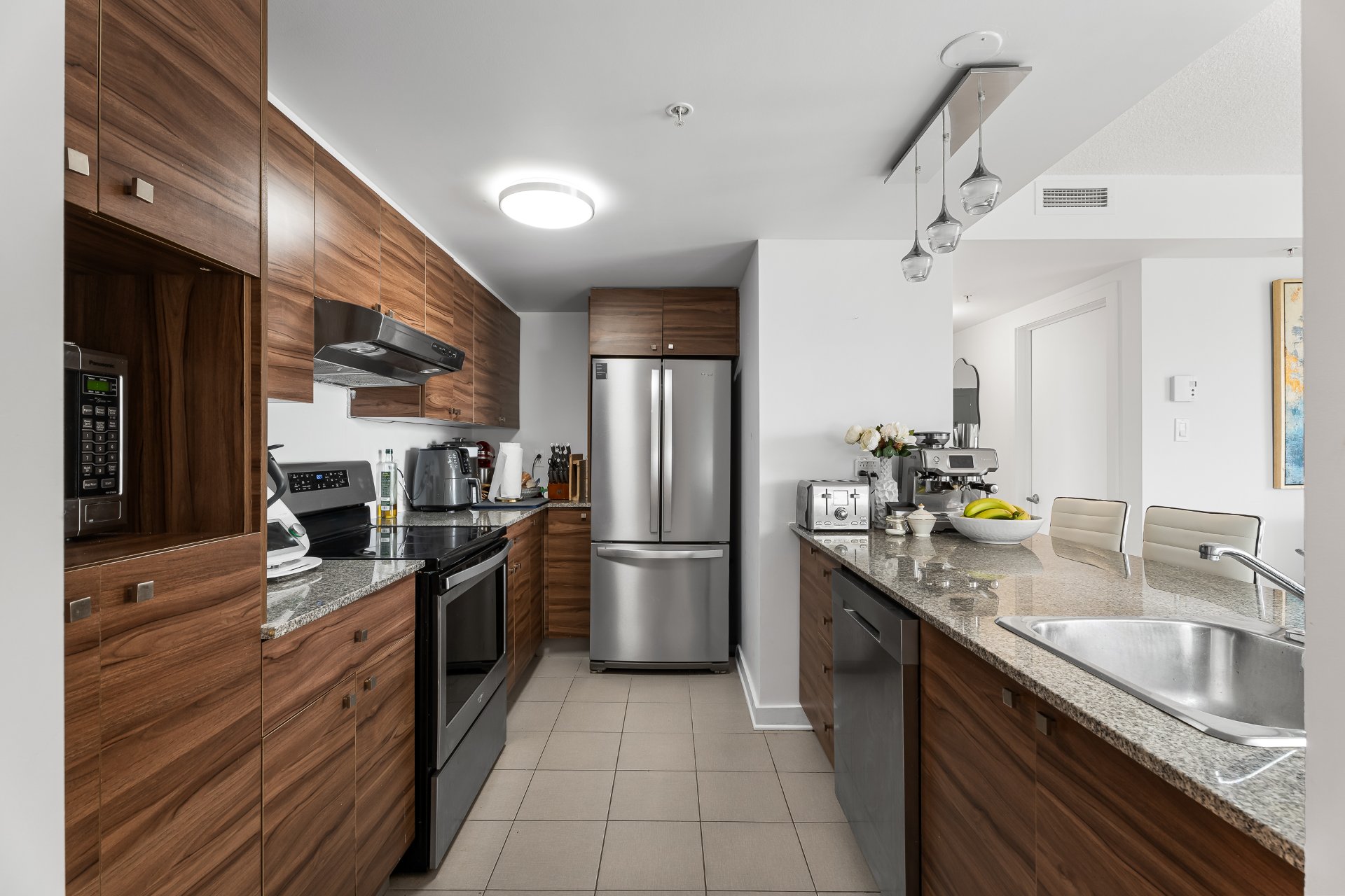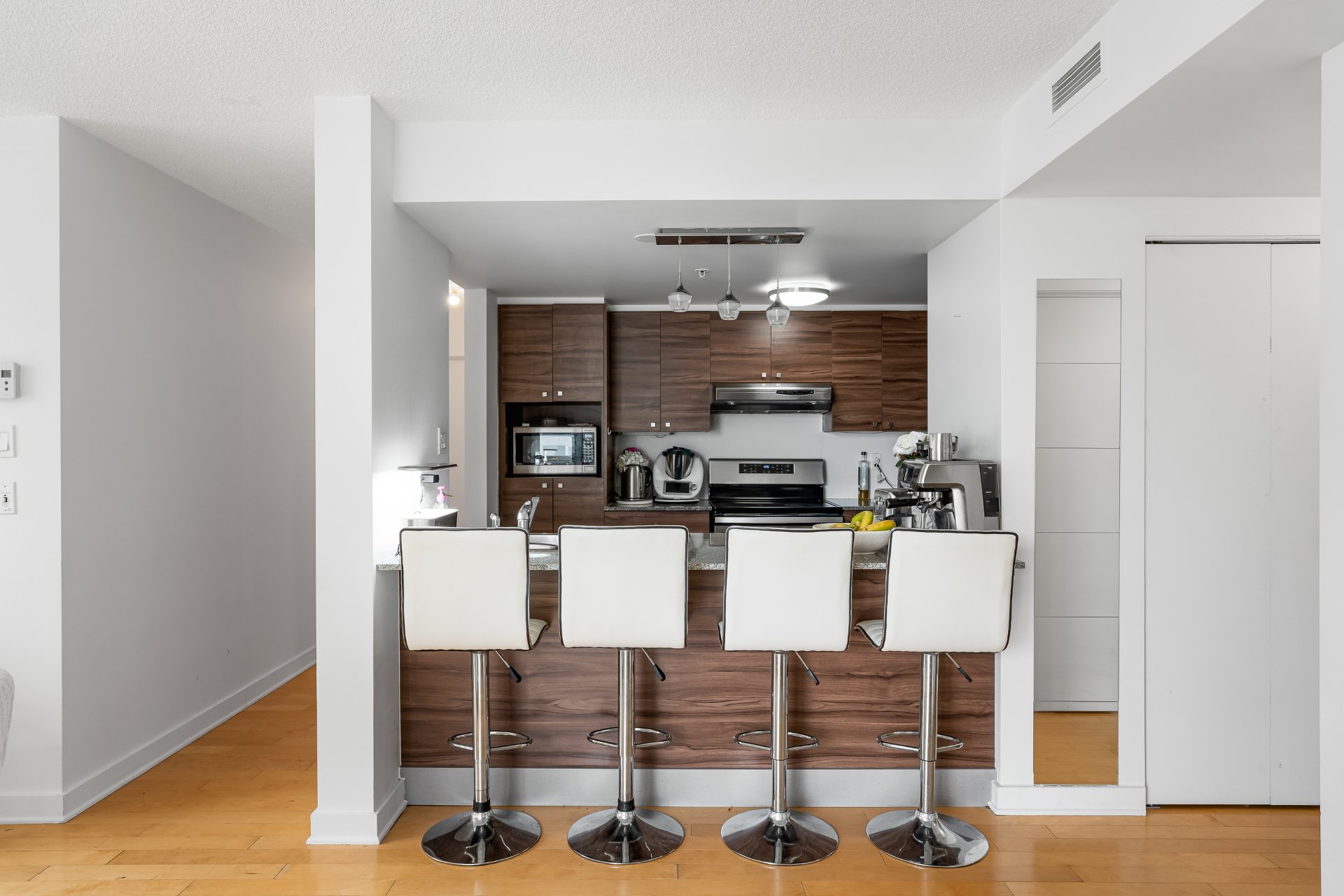 Condo moderne à louer;. Unité lumineuse offrant une abondante fenestration et des finitions de qualité. Immeuble en béton armé assurant une excellente insonorisation et durabilité. Stationnement intérieur et espace de rangement inclus. Arrêt d'autobus devant l'entrée, gare à 5 min et accès rapide aux autoroutes 15 et 40. À proximité du Marché Central, Adonis, écoles et collèges.